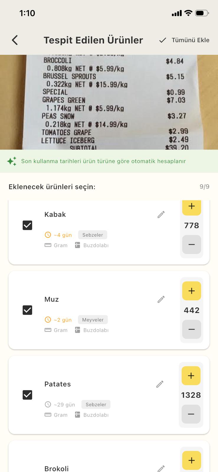 Fişlerinizi tarayarak ürünleri dijital kilerinize ekleyin.